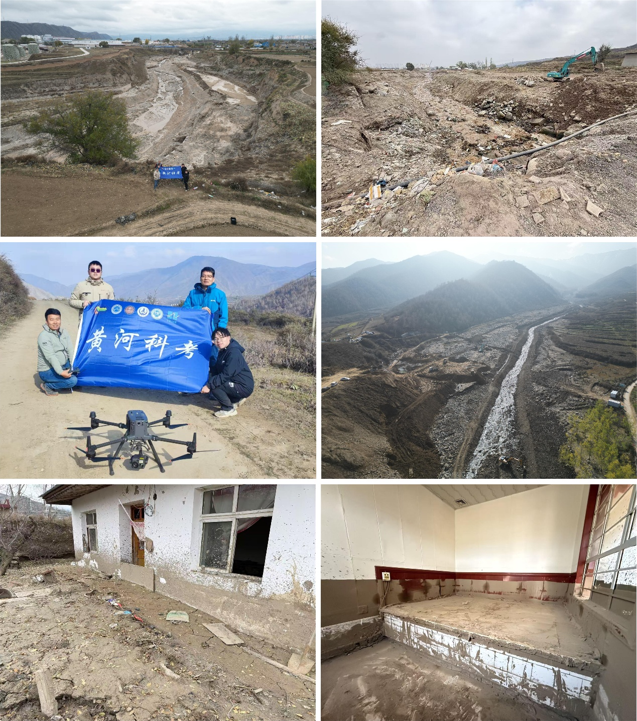 第二站在甘肃榆中县,针对兴隆山“8.7”特大山洪事件开展暴雨洪水与生态受损灾后调查,并现场航摄取证。考察范围覆盖滑坡崩塌区、泥沙沉积区,总考察路线长度65 km。依据泥沙沉积区内受损房屋中洪痕判断,洪水蔓延最高处大于1.7 m。截止考察当天,灾情发生已近三个月,但灾后清淤及相关工作仍任重道远。