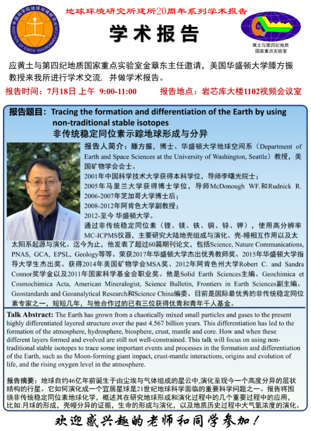 7月18日学术报告通知:非传统稳定同位素示踪地球形成与分异