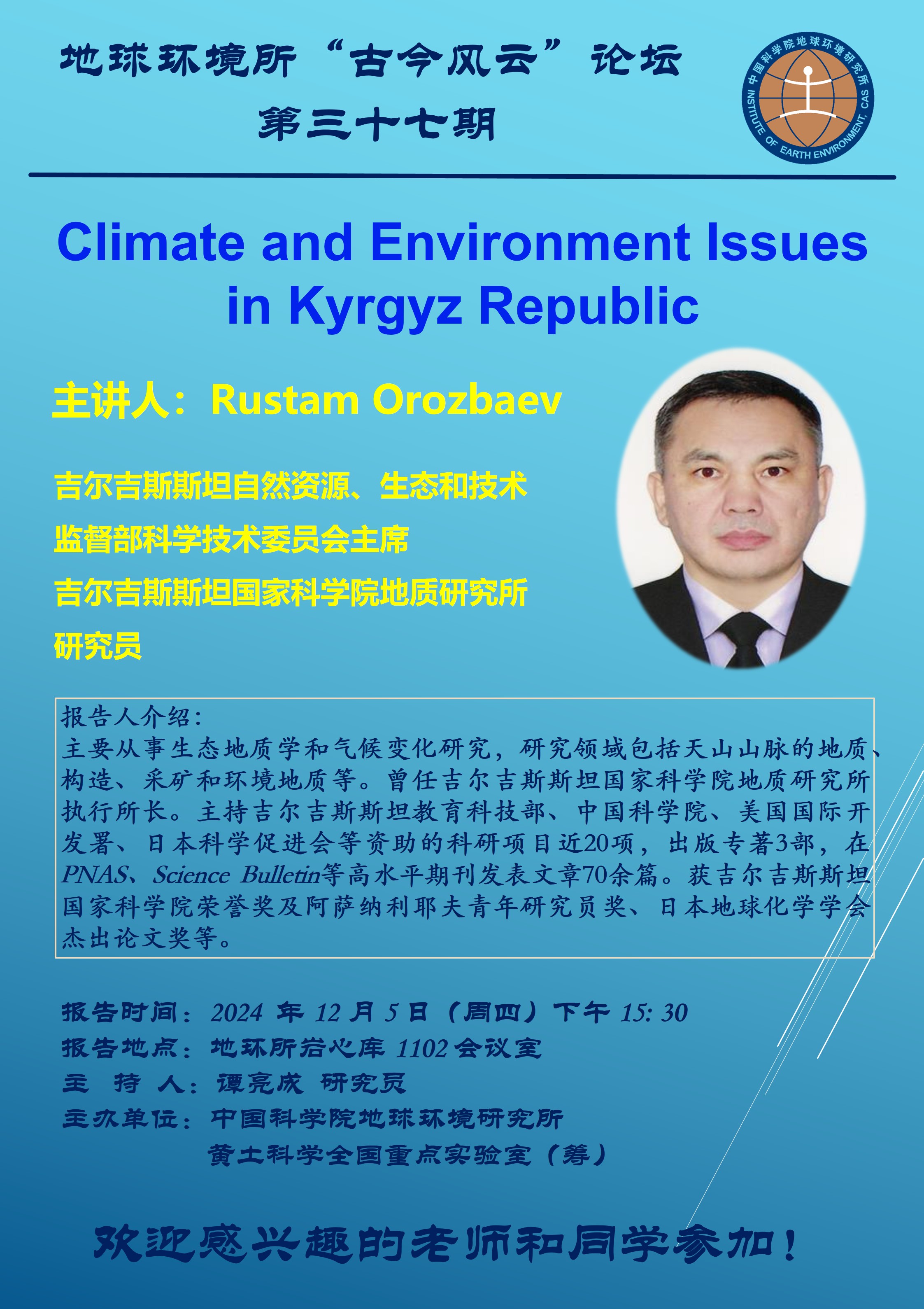 地球环境所“古今风云”第三十七期 Rustam Orozbaev研究员学术报告(12月5日)