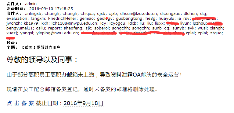 近期,有个别用户收到不明用户发来的邮件,以邮箱不安全或给什么什么造成危害为由,要求点击某个链接进行备案或认证(附图)。请大家千万造成不要点击此类邮件中的链接。
