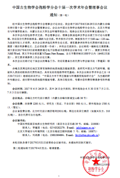 中国古生物学会孢粉学分会十届一次学术年会暨理事会议通知(第一轮)