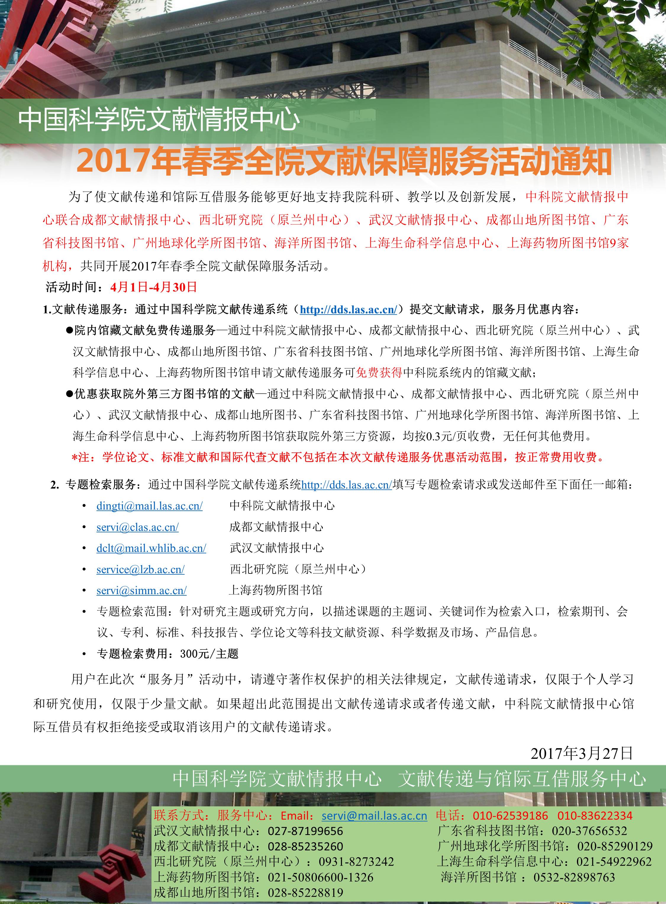 2017春季中科院“文献传递服务月”活动通知