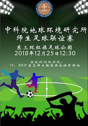 2018年中国科学院地球环境研究所师生足球赛将于2018年12月25日在西安红旗足球公园举行,该活动由中国科学院地球环境研究所学生会主办。