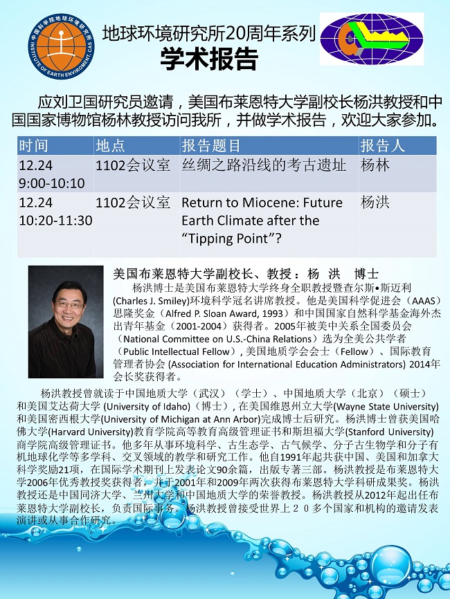 中国科学院地球环境研究所(以下简称“地球环境所”)成立于1999年,前身是1985年成立的中国科学院西安黄土与第四纪地质研究室,是中国科学院知识创新一期工程中唯一升格为研究所的单位。 地球环境所以“探索地球环境奥秘、服务生态文明建设”为使命,瞄准地球科学科技前沿,开展多尺度气候环境变化机理研究,致力于为地球系统科学发展做出创新性贡献,面向人与自然和谐共存的重大需求,为黄土高原及我国西部生态屏障建设提供战略科技支撑。 地球环境所秉承“如履薄冰、奋发图强”的黄土精神,扎根西部、砥砺前行,提出了一系列原创理论,使中国黄土成为国际公认的全球变化三大支柱之一,不断引领黄土与全球变化研究。研究成果8次获国家自然科学奖,3次入选中国科学十大进展。黄土与第四纪地质国家重点实验室连续7次评估优秀,研究所两次国际化评估中被认定为“世界级的大陆环境变化研究中心,具有世界级研究水平”。