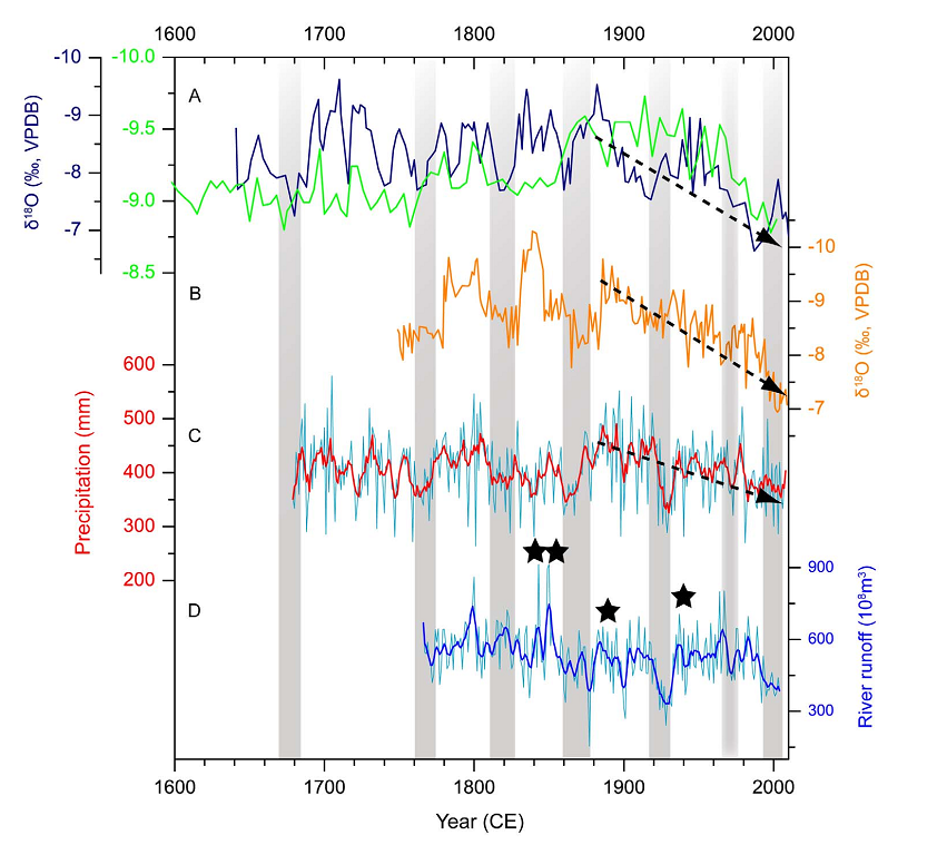 甘肃石笋、树轮记录重建的黄土高原降雨变化以及历史文献记录重建的三门峡径流量变化的对比关系。(A)甘肃乌鸦洞WY27(暗蓝色)和甘肃黄爷洞HY3(绿色)氧同位素记录;(B)甘肃乌鸦洞WY33氧同位素记录;(C)甘肃兴隆山树轮重建的年降雨量变化;(D)历史文献记录重建的黄河中游三门峡站径流量变化。黑色五角星代表过去200年黄河的四次决口事件,分别发生于1841–1843、1855、1887 和1938年。