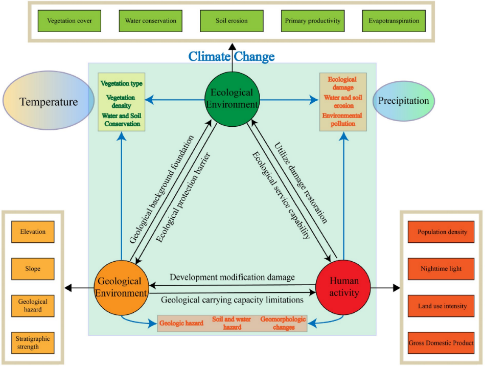 秦岭是我国中央生态屏障带,也是维系国家生态安全的关键区域。受秦岭山脉地形的影响,该地区气候多变,暴雨局地性强、突发性高、雨量大且频发,水土灾害严重。秦岭生态地质灾害与人类活动和生态退化高度相关,且多集中于地质条件脆弱、地形起伏大的区域。近20年来,秦岭城镇扩张、交通建设与土地利用变化加剧,进一步加重了秦岭地质–生态系统的多重压力。因此,如何在保障经济社会发展的同时,统筹考虑地质环境与生态系统的耦合协调关系,研究地质环境对生态环境的控制作用及人类活动对生态环境的影响,揭示地质环境-生态环境-人类活动的耦合互馈效应,对秦岭自然资源开发、生态环境保护和经济社会可持续发展具有重要指导意义。