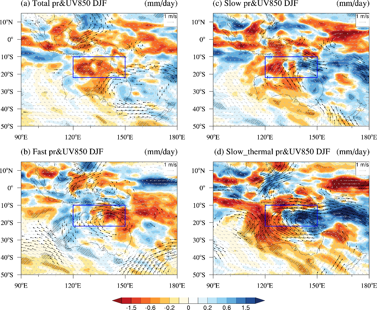 最近,中国科学院地球环境研究所气候变化集成-模拟-同化-预测(CLIMAP)团队基于耦合沙尘循环过程的全球气候模式,通过海气耦合、固定海温、平板海洋模拟实验,研究了沙尘直接辐射效应对澳大利亚夏季风的影响。研究发现,沙尘气溶胶的直接辐射效应会减弱澳大利亚夏季风的环流强度,并导致季风区降水显著减少(图1)。对于澳大利亚季风,海洋慢响应(包括热力学和动力学过程)在沙尘气候效应中占据了主导地位,其重要性超过了大气对沙尘的快响应。具体而言,沙尘引起的辐射强迫导致低纬度海洋出现显著的海表降温,削弱了澳大利亚东海岸的局地经向环流,该环流的减弱有利于在澳大利亚东部形成气旋性异常及南风异常,从而抑制季风推进和减少降水(图2)。该研究揭示了沙尘气溶胶对澳大利亚夏季风的影响及其物理机制,深化了对沙尘-季风相互作用机制的理解。